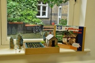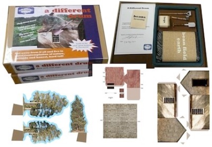 Boxed “executive toy” made in multiples for sale. The boxed set provides desk-bound executives with the opportunity to create their own miniature hut in the wilderness, and tend a miniature bean field.