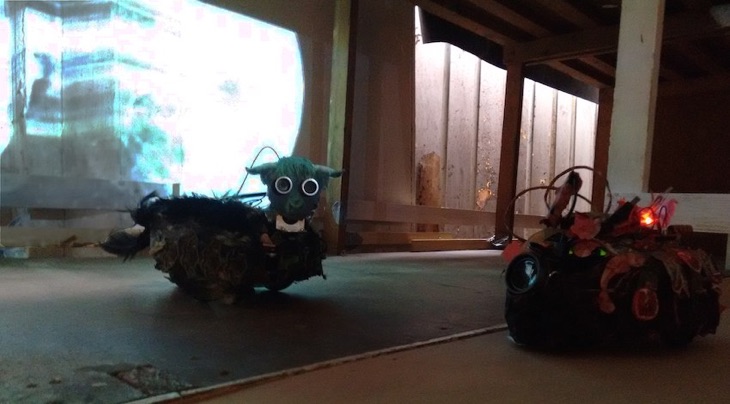 Installation with costumed robot actors and projected video.